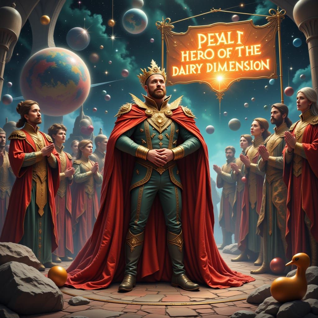 This image shows Captain Dawn in a cape with constellations, leading an award ceremony. Alien dignitaries, space ducks, and robots applaud under a banner in this humorous, regal scene, reminiscent of Moebius's retro-futurism.