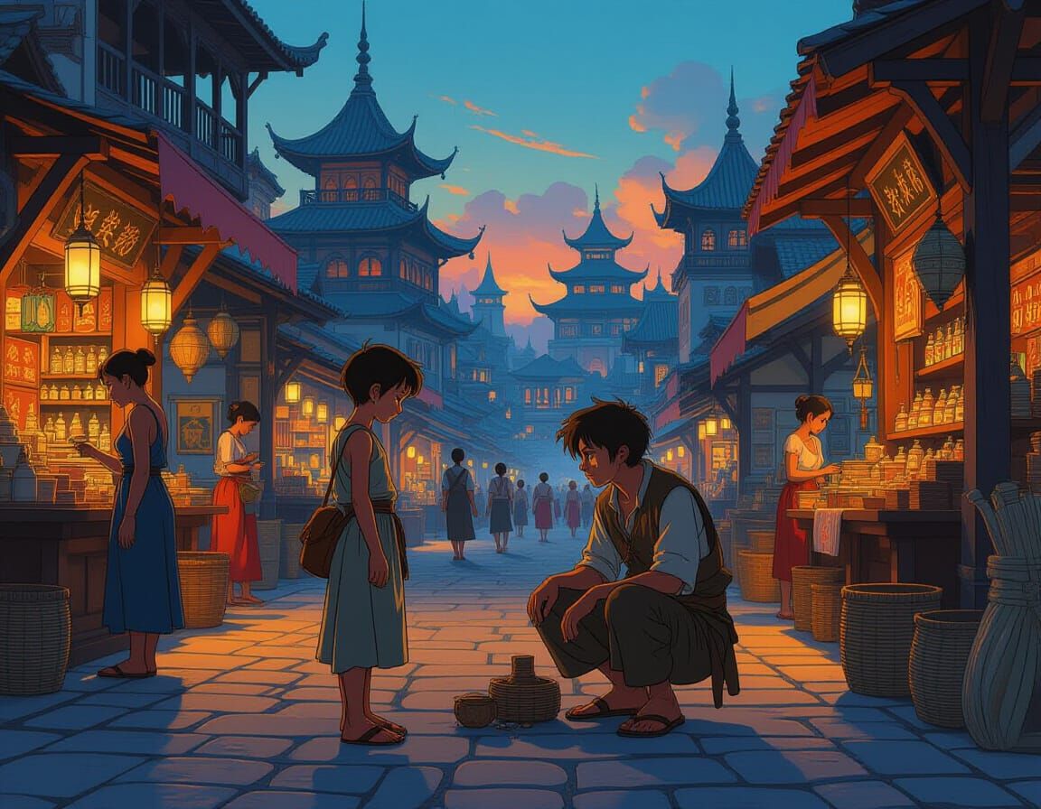 A vibrant medieval harbor scene at twilight depicts a barefoot urchin begging for alms. Mediterranean and Thai-inspired architecture and bustling market stalls fill this fantasy concept art piece.