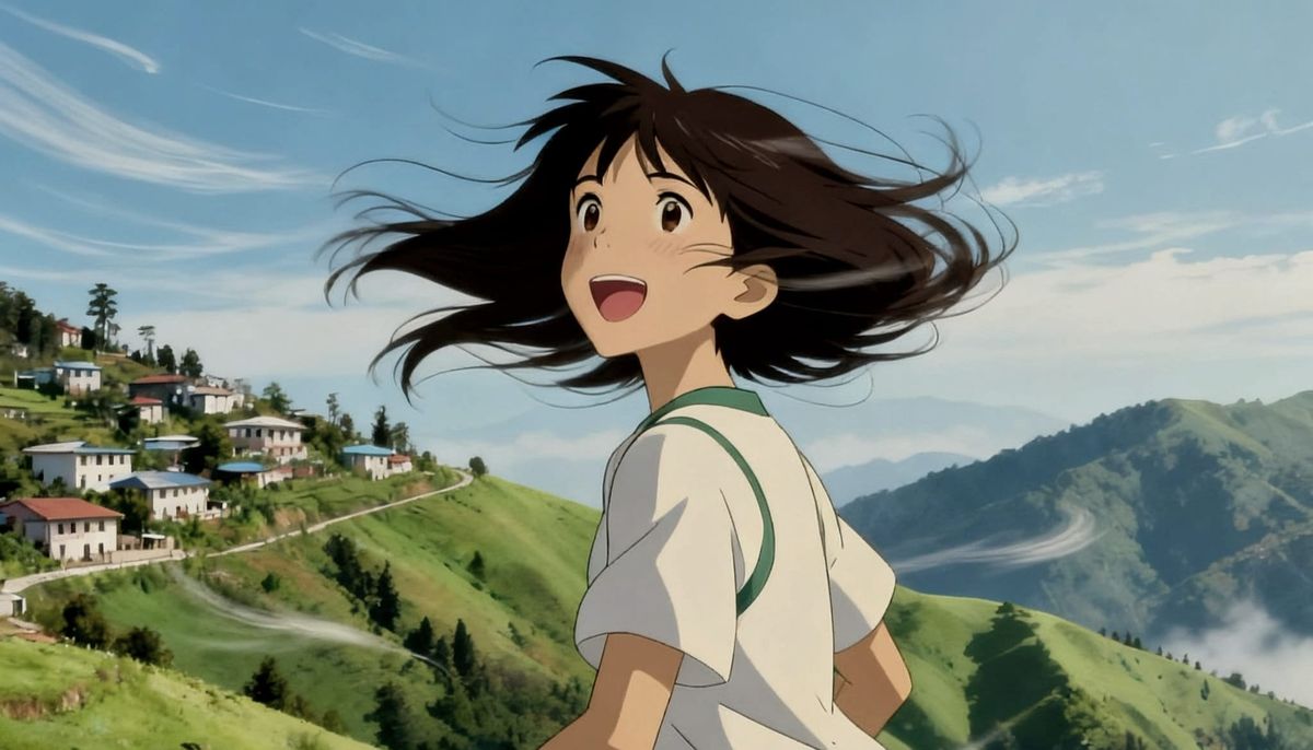 This anime-style image shows a young woman walking in a scenic hill station, with her hair gently blowing in the wind as she savors the pleasant weather.