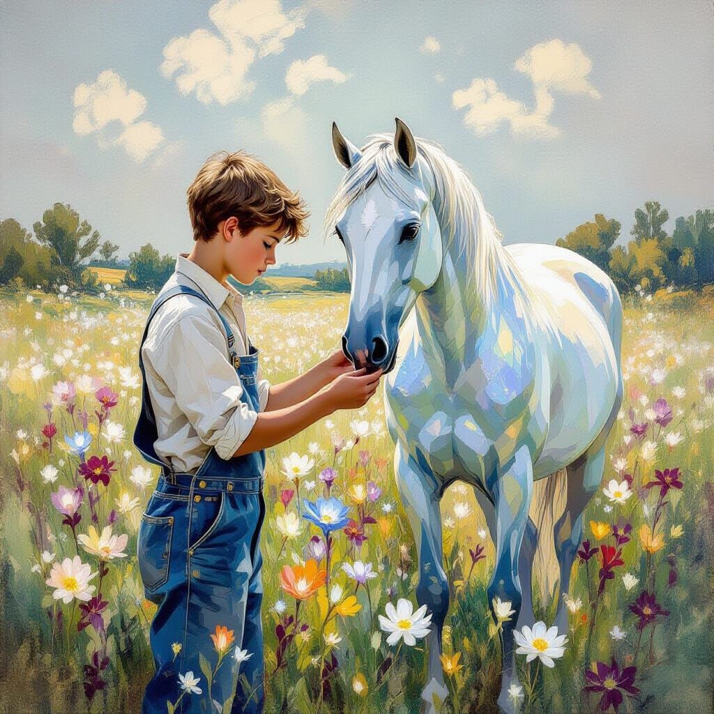 This image shows a young stable boy caring for a glowing, crystalline horse amidst shimmering bioluminescent flowers, rendered with delicate brushstrokes and soft, ethereal lighting.