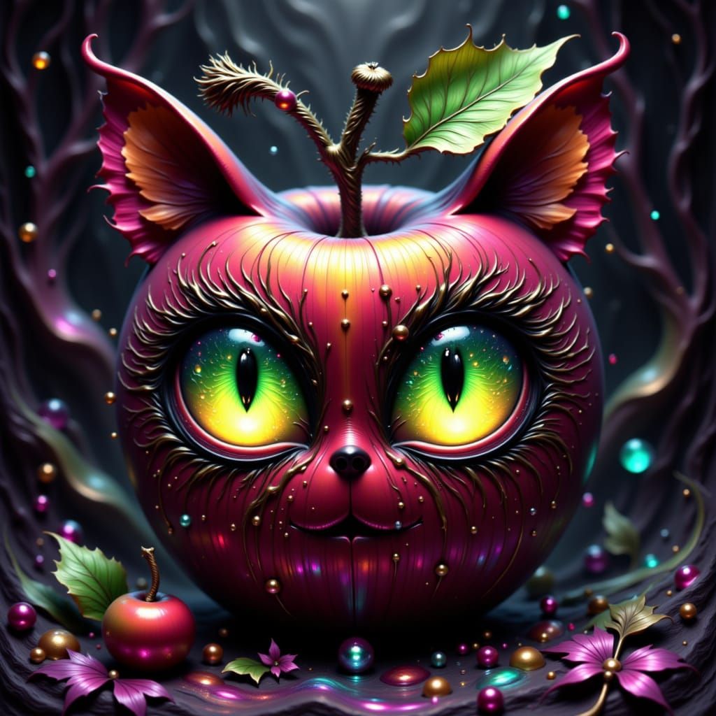 This hyper-detailed fantasy art shows a stylized apple with large, shimmering chibi cat eyes. Vibrant colors and a magical glow create a surreal, luminous effect.