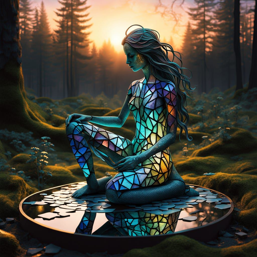 This image shows a surreal sculpture of a woman kneeling at sunset. The bio art collage incorporates mythological creatures and abstract designs to symbolize strength and authenticity.