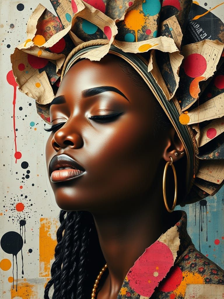 This image features a beautiful Black woman with closed eyes, depicted in a vibrant Flux art style. The artwork incorporates torn paper, paint splatters, and abstract shapes with rich textures.