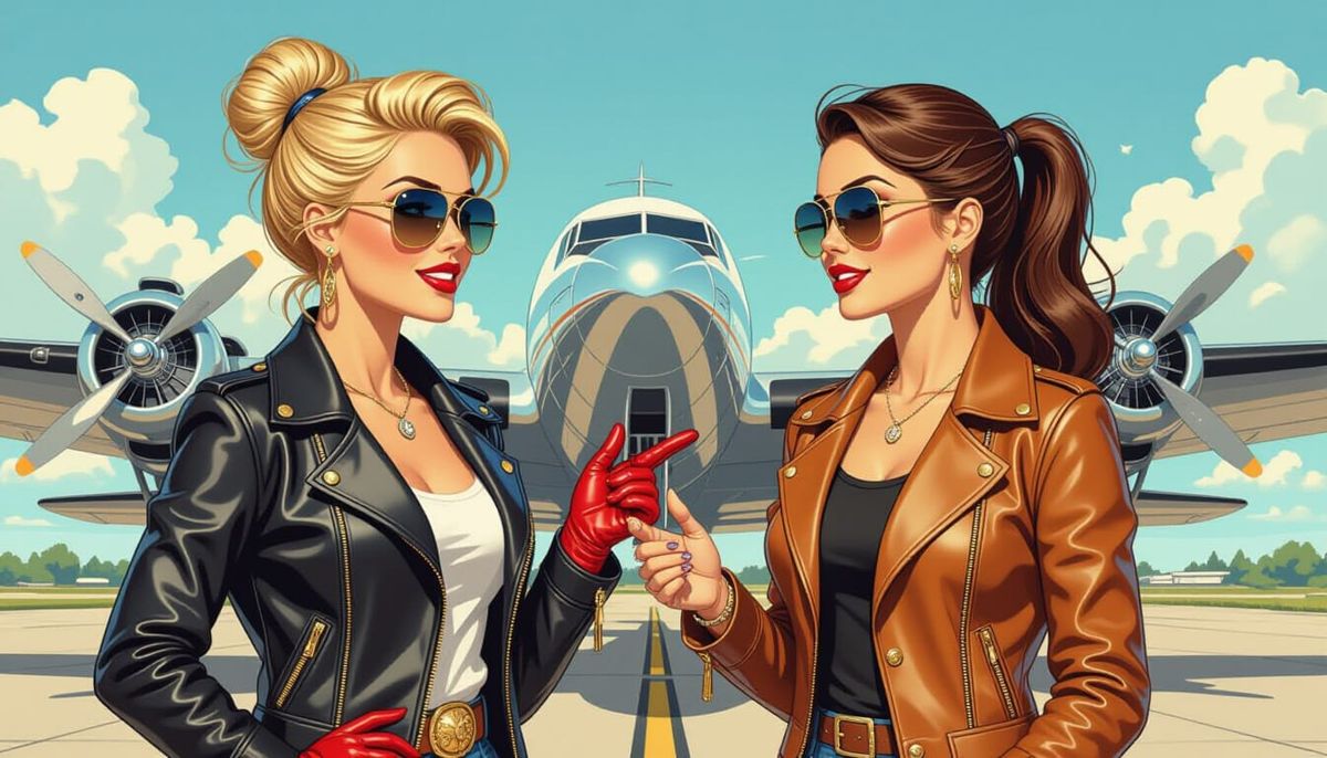 A vibrant comic book style illustration of two attractive female pilots in front of a classic Douglas DC-3 aircraft. The artwork features smooth lines and captures their natural beauty.