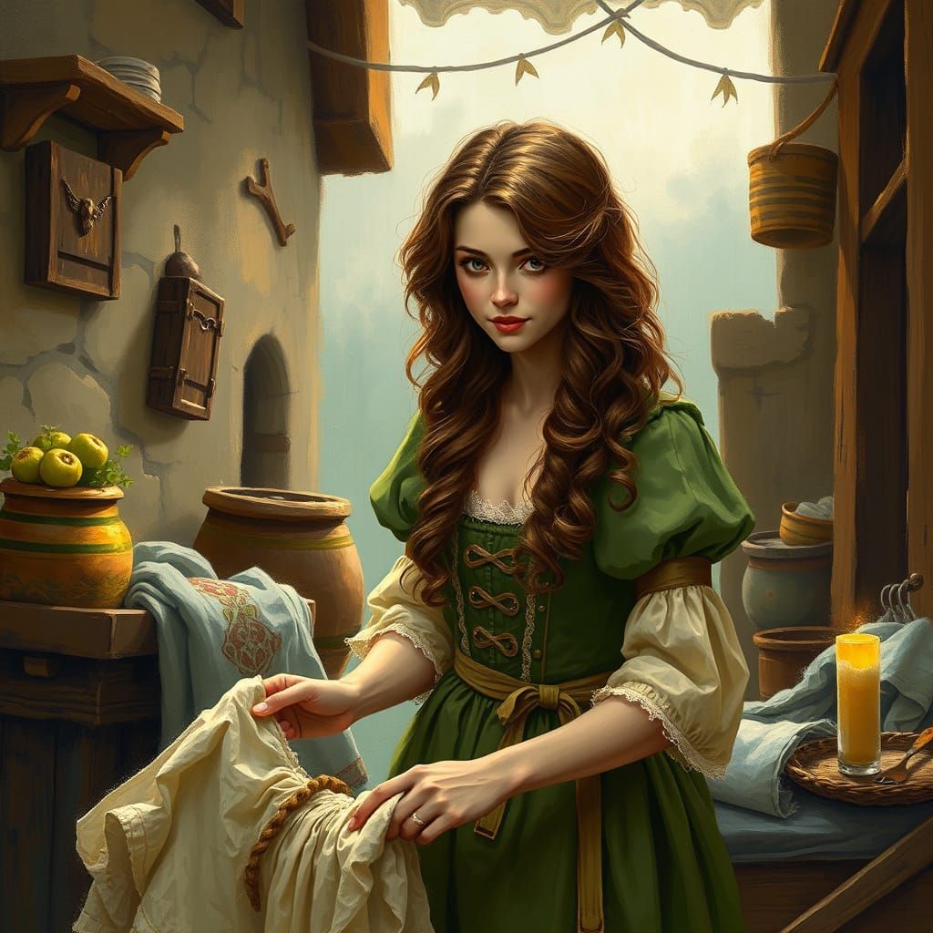 A striking picture of a woman in medieval dress doing laundry. The image is reminiscent of an oil painting with soft brushstrokes and earthy tones, creating a warm and intimate atmosphere in a whimsical style.