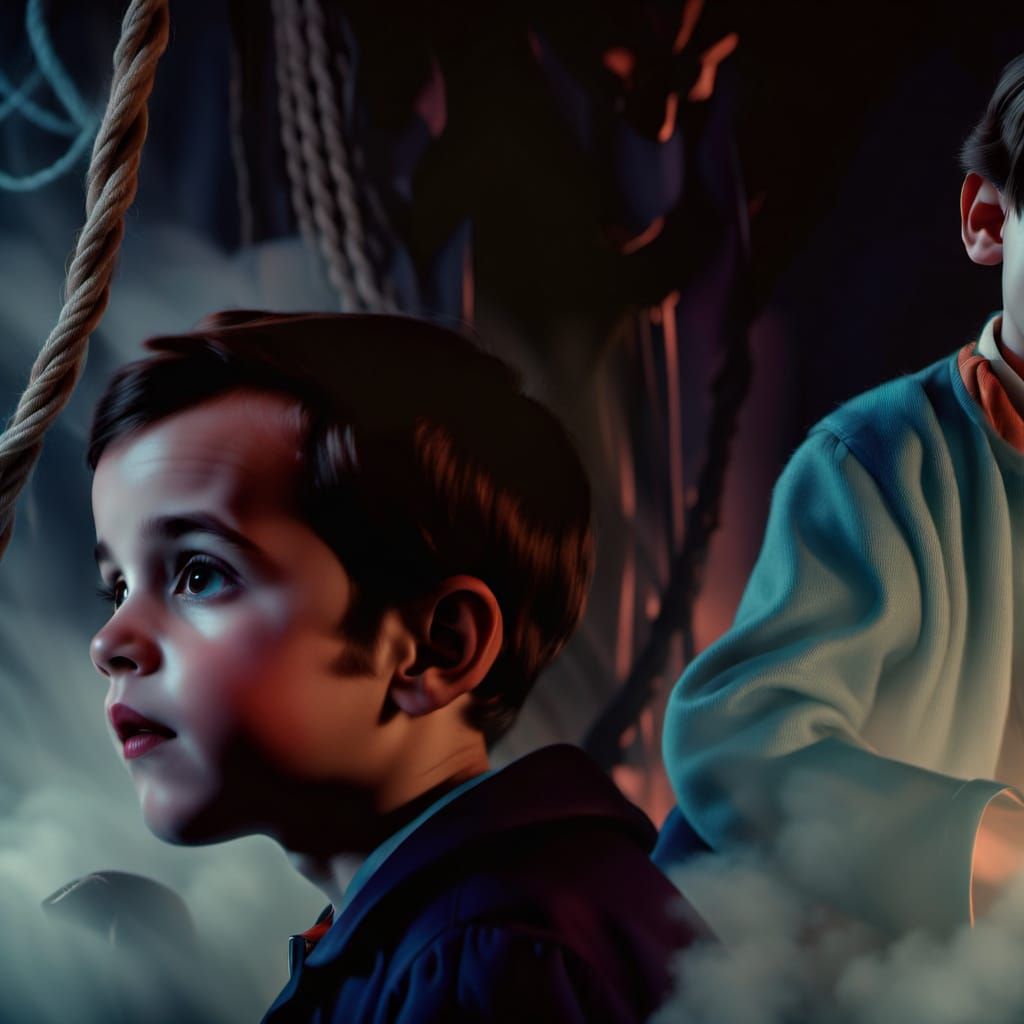 A close-up of a tangled mess of white rope at the photographer's feet, with vibrant red fibers emerging from the fog, captured in a Drew Struzan-inspired editorial style with soft, regal lighting and intricate texture details.