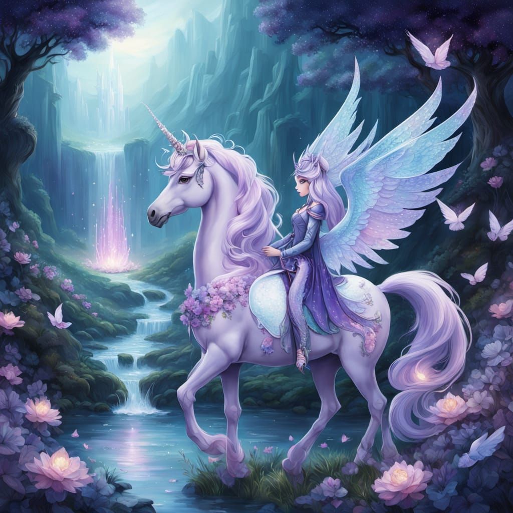 A close-up image shows a majestic alicorn and enchantress riding through an enchanted valley. The scene is rendered in soft twilight hues, with sparkling gemstones and floral dust.
