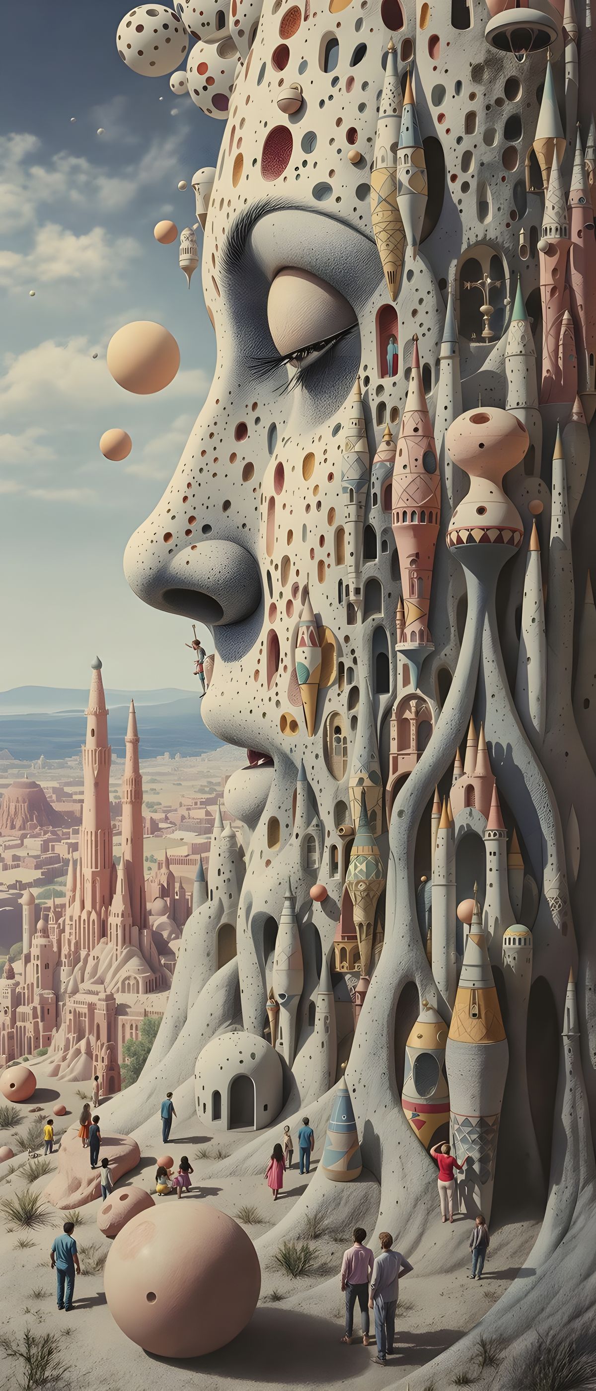 This image shows a surreal landscape reminiscent of Cappadocia. The artwork, rendered as a color pencil drawing, evokes the style of Igor Morski with dreamlike qualities.