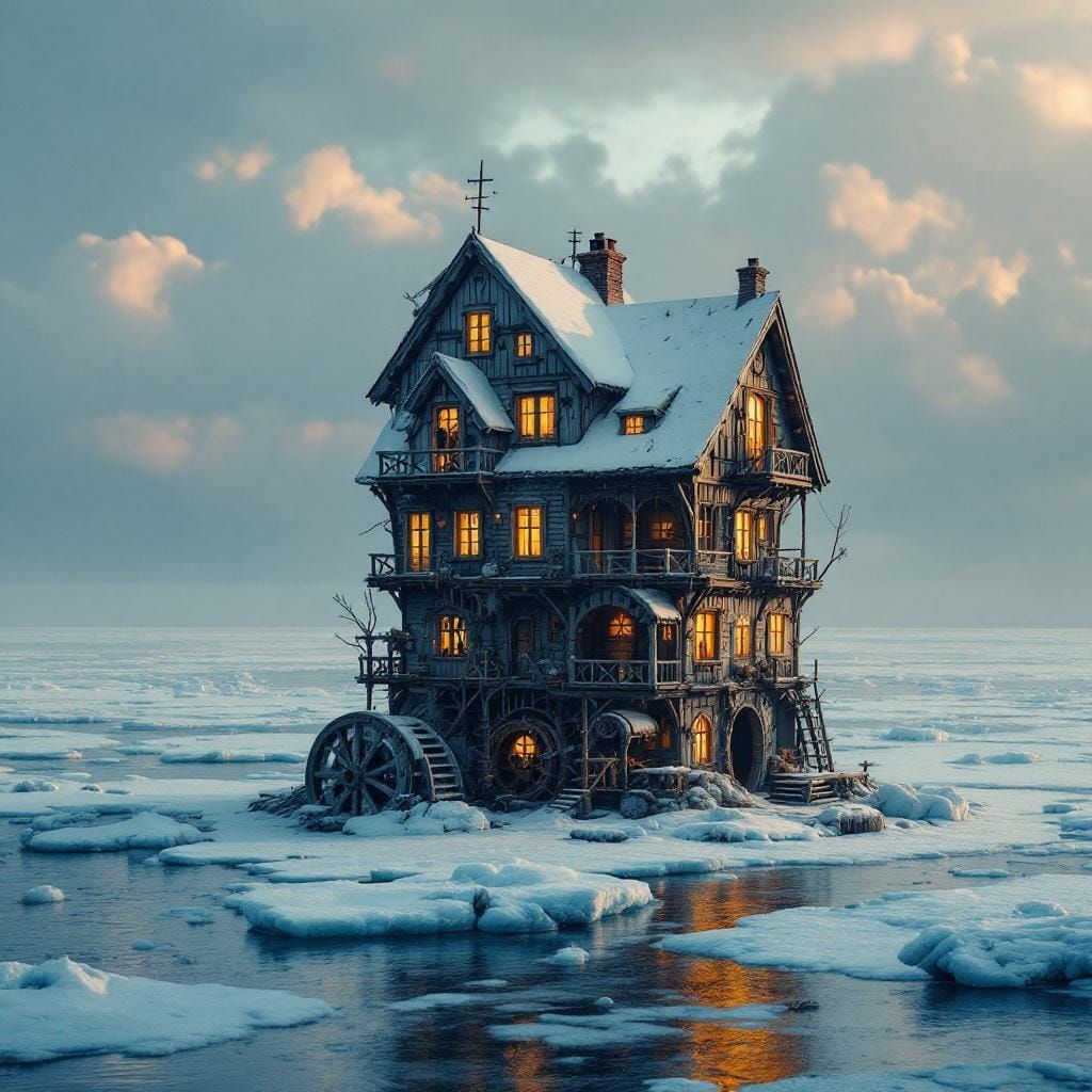 This image shows a white, crooked, multi-story icepunk house with a waterwheel. It sits on a tiny ice island in a frozen ocean, illuminated by golden light under gathering snowstorm clouds.