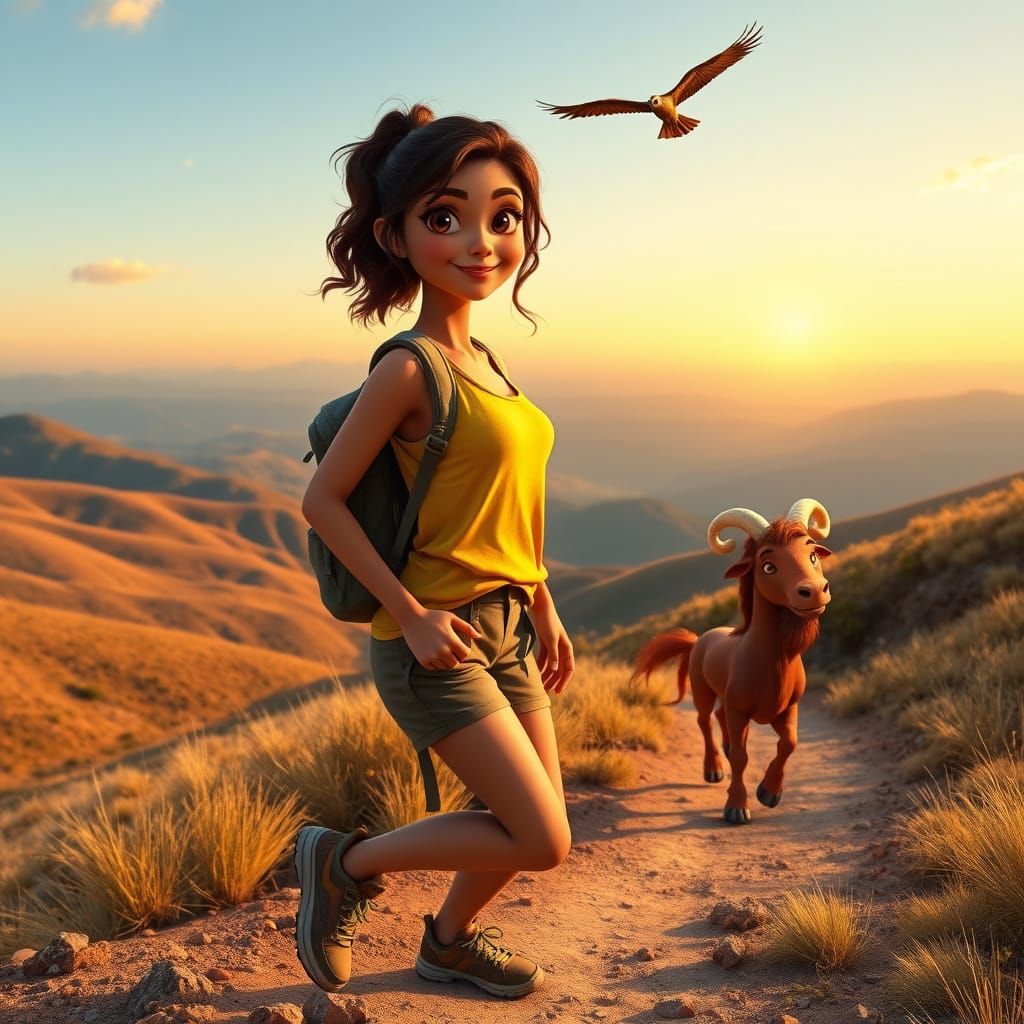 This image shows a vibrant woman hiking through rolling hills at sunset. A small, friendly minotaur accompanies her in this scene evoking adventure and freedom, rendered with smooth textures in a whimsical style.