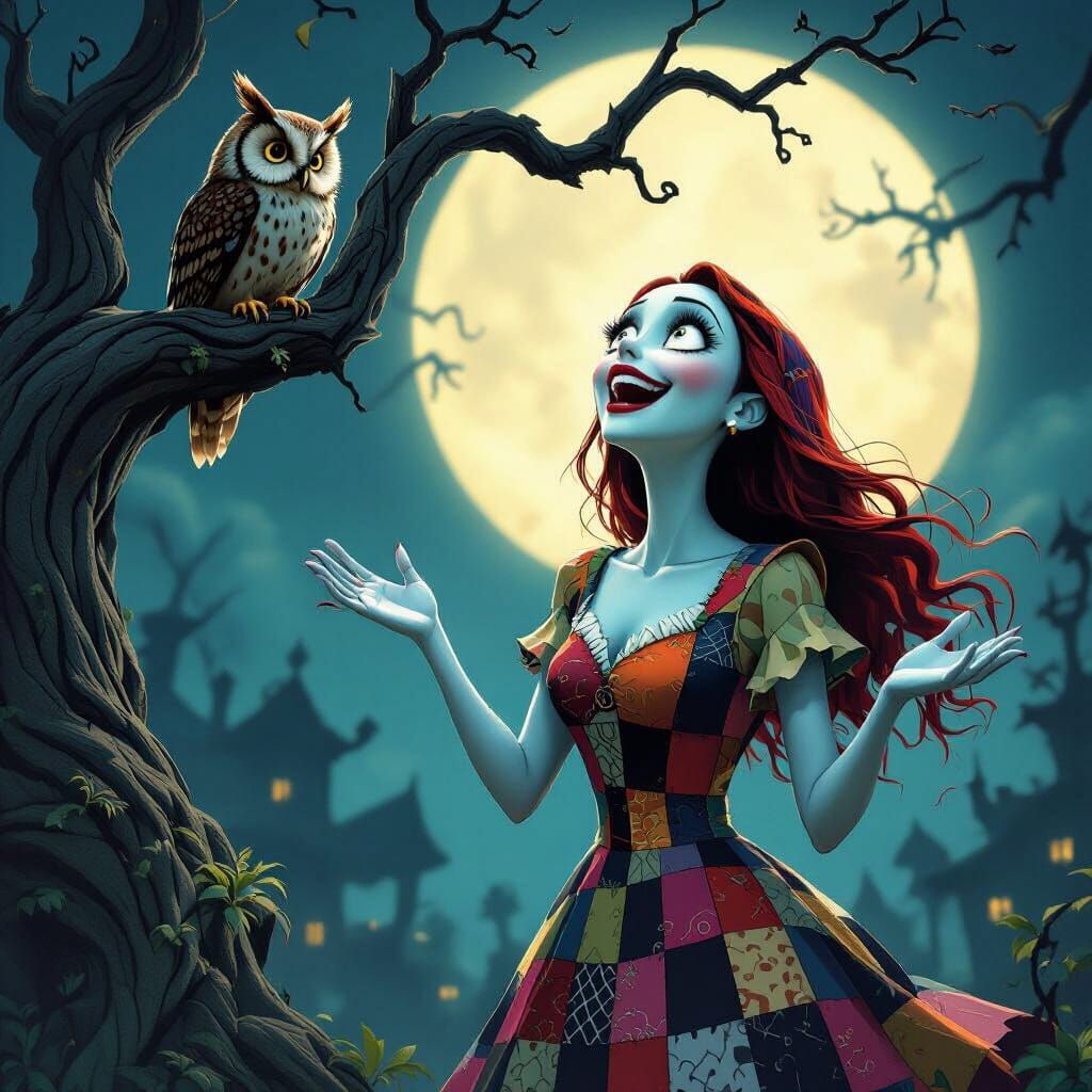 A hyperrealistic portrait of Sally from The Nightmare Before Christmas singing happily, bathed in moonlight. A wise owl watches from a gnarled tree. Gothic fantasy illustration style.