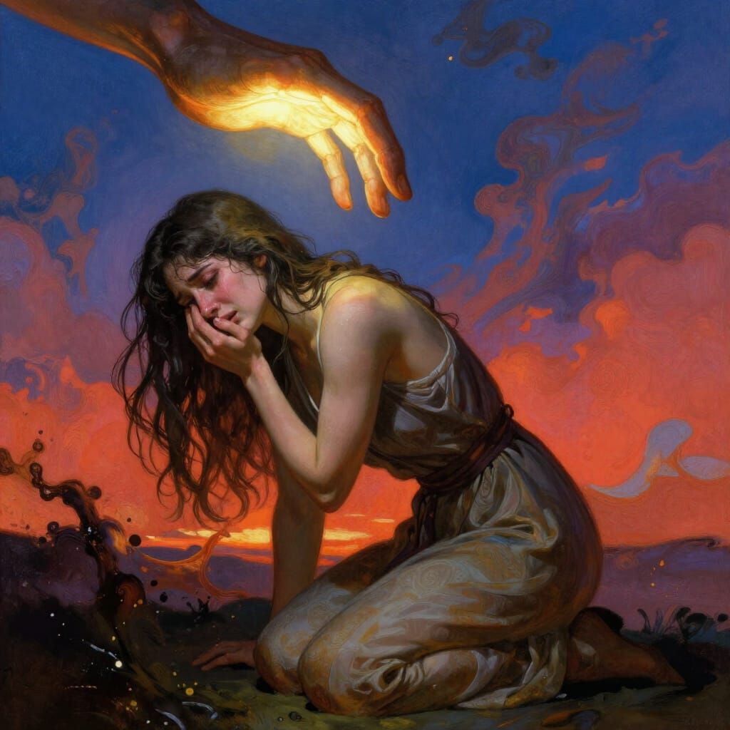 This image shows a woman crying on her knees as a large, radiant hand descends from the sky. Rendered in a hyperrealistic, concept art style with dramatic lighting and rich color depth.