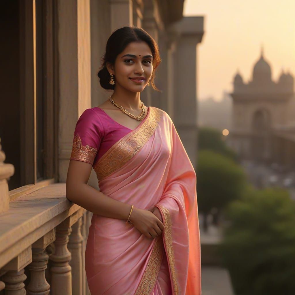 Cinematic film still of an elegant Indian woman on a balcony at sunset. Golden hour lighting highlights her serene expression and detailed pink saree. Photorealistic quality.