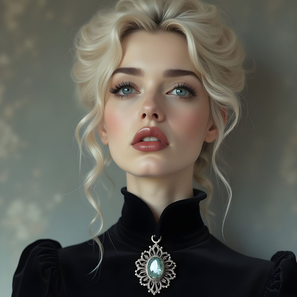 This portrait features a woman with striking platinum hair and piercing blue eyes, set against a softly blurred background. Her elegant and mysterious face is adorned with a black velvet choker and vintage silver pendant.