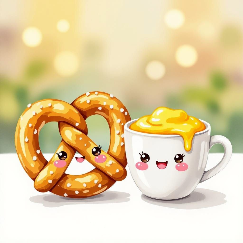 This charming watercolor illustration features a smiling pretzel and a cup of melted cheese dip, depicted in a cute kawaii style with bright, glossy colors on a white background.