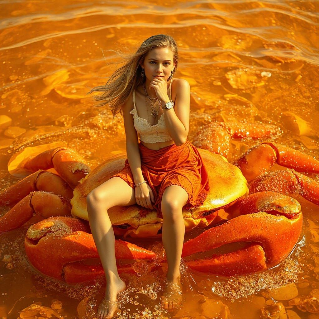 A woman with golden hair and bohemian clothes sits on a giant gummy crab in a colorful, dreamlike soda sea. Features ethereal lighting and shimmering bubbles.