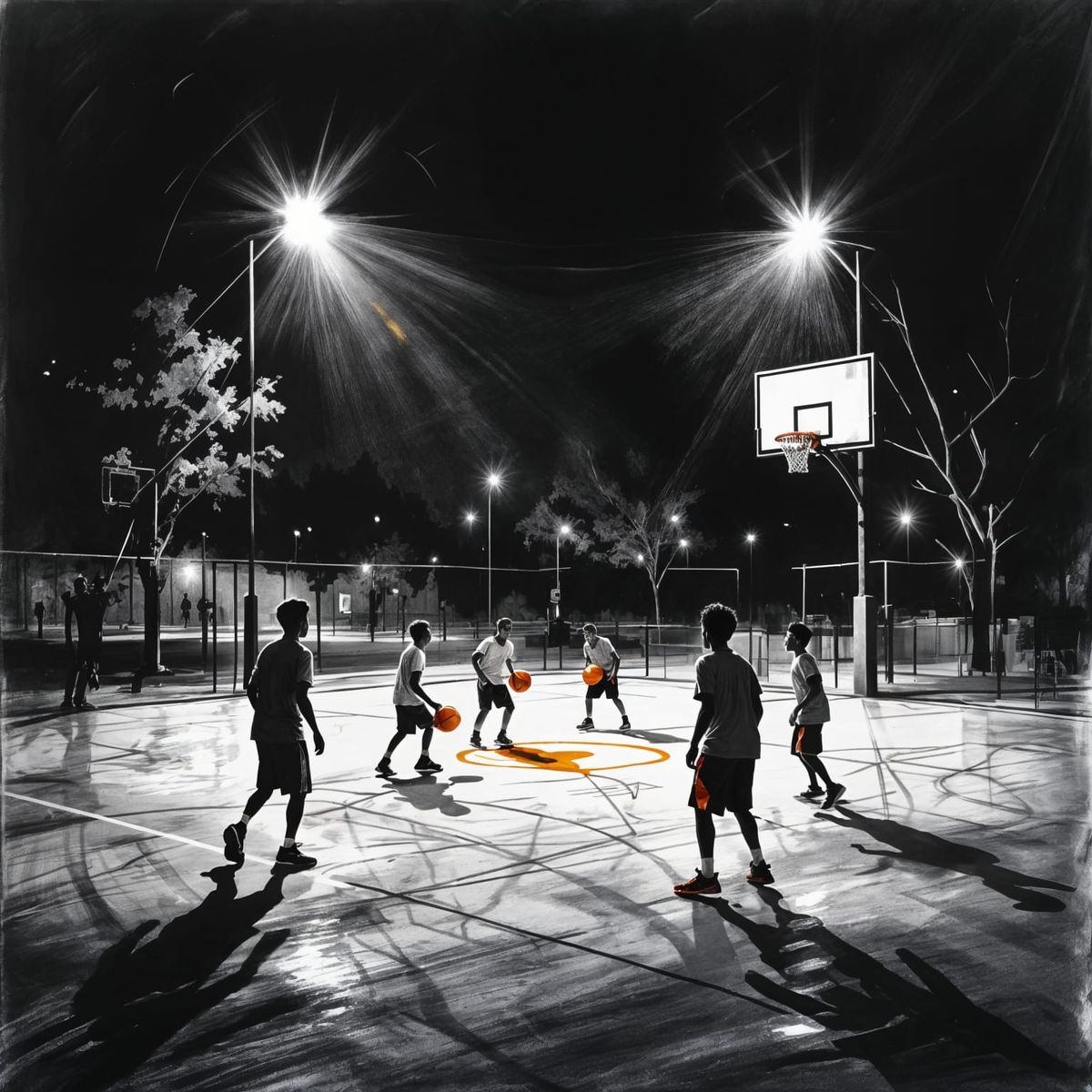 A charcoal drawing of a dusk-lit urban basketball court with teenagers playing under glowing streetlights. Deep shadows and scratchy textures enhance the dynamic scene, with a vivid orange basketball providing striking contrast.