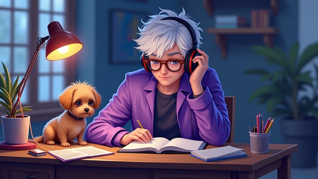 A digital painting of a person with white hair and purple clothing reading at a desk. A brown dog sits nearby in a cozy atmosphere enhanced by blue, purple, and pink lighting.