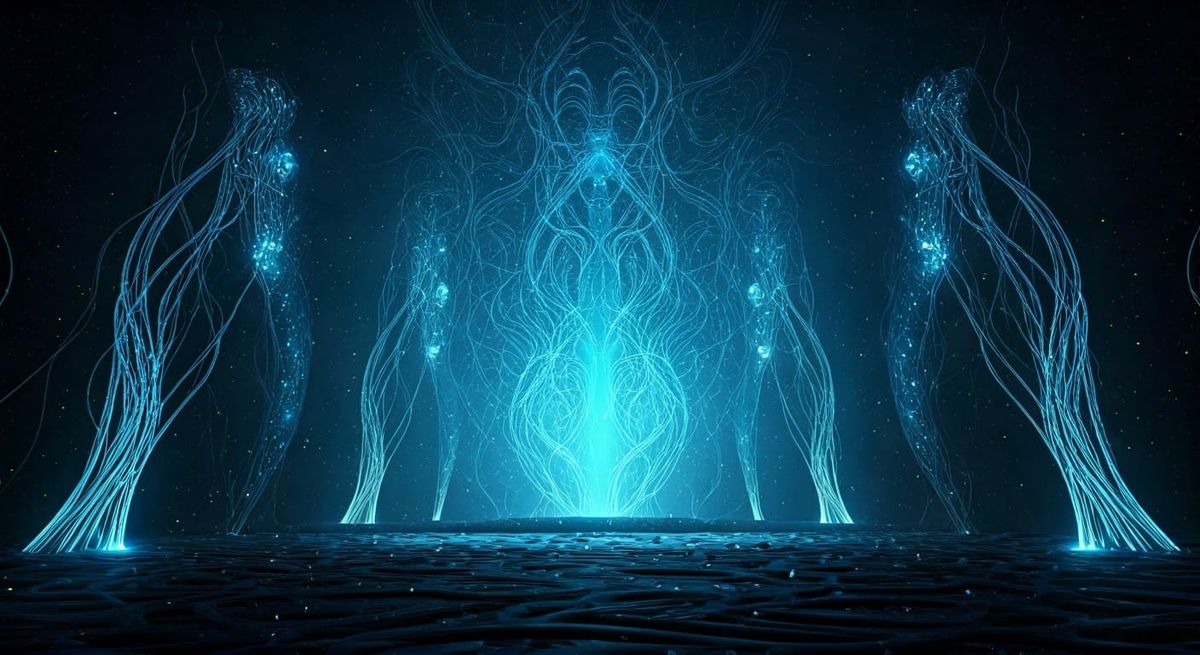 This image depicts a futuristic, hyperrealistic scene where Adinkra symbols and organic data streams intertwine, pulsing with electric blue energy. Cybernetic orishas take form in a shimmering savanna, evoking a sense of wonder and awe, with intricate patterns and otherworldly energy reminiscent of Syd M...