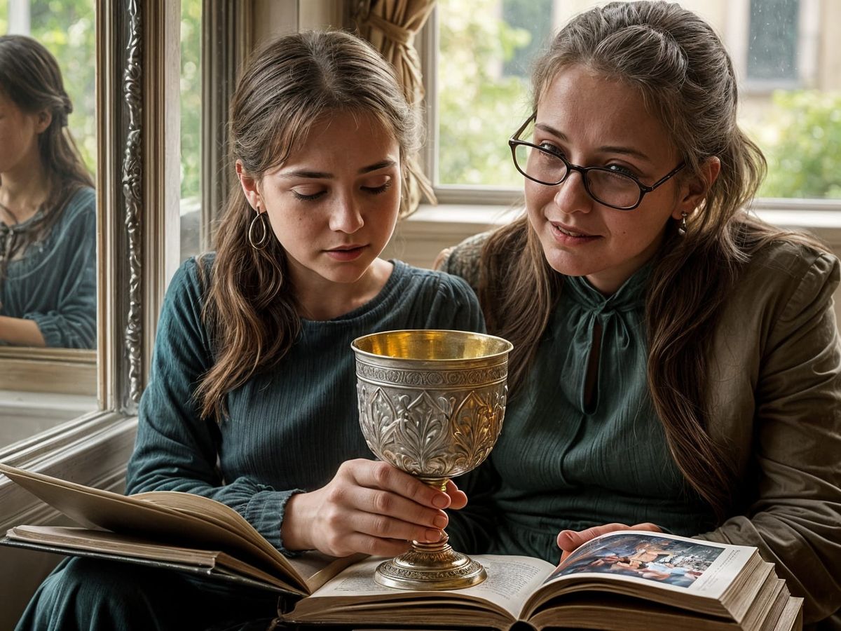 This image shows a photorealistic rendering inspired by a story. It depicts a young girl discovering a historical connection between a painting and a family heirloom. The scene is rich in detail.
