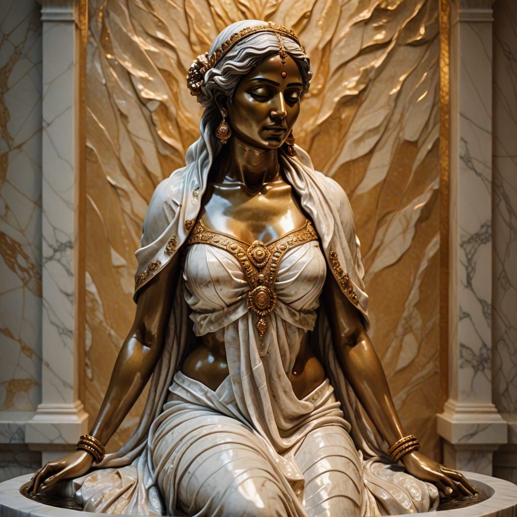 A striking picture of a marble sculpture depicting a beautiful Indian woman bathing. The sculpture features intricate details, soft lighting, and an elegant composition in a Baroque style.
