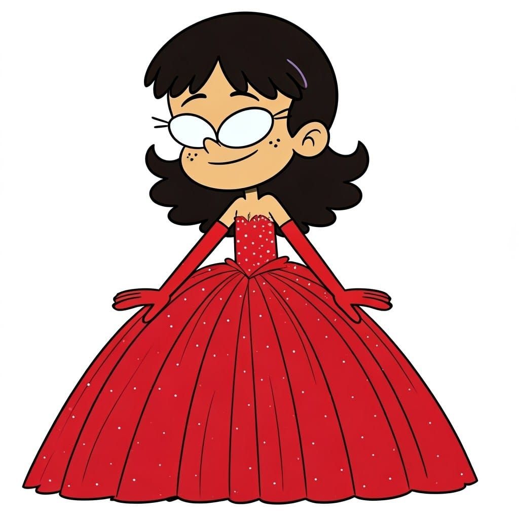 The Loud House Cartoon Style: short 12 year old tween skinny Stella Zhau with her very long hair down wearing a long large wide floor length red tulle Sleeveless poofy gown in a dome shape. The dress has a sweetheart neckline and is embellished with rhinestones. She is also wearing long red fingerless ...