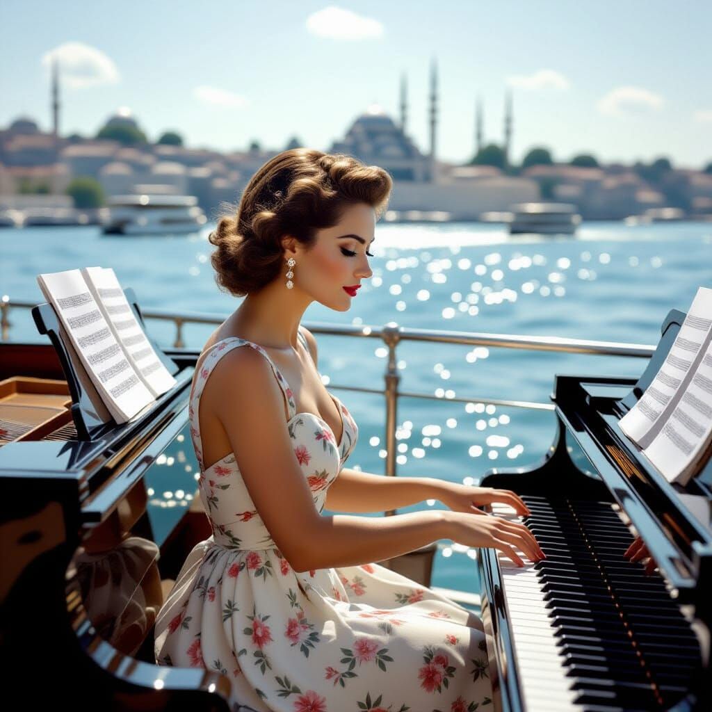 This image depicts a sad, beautiful blonde woman playing the piano on the grass at Pearl Harbor during the sunset in 1941. A dog howls beside her within a cinematic, filmic aesthetic.