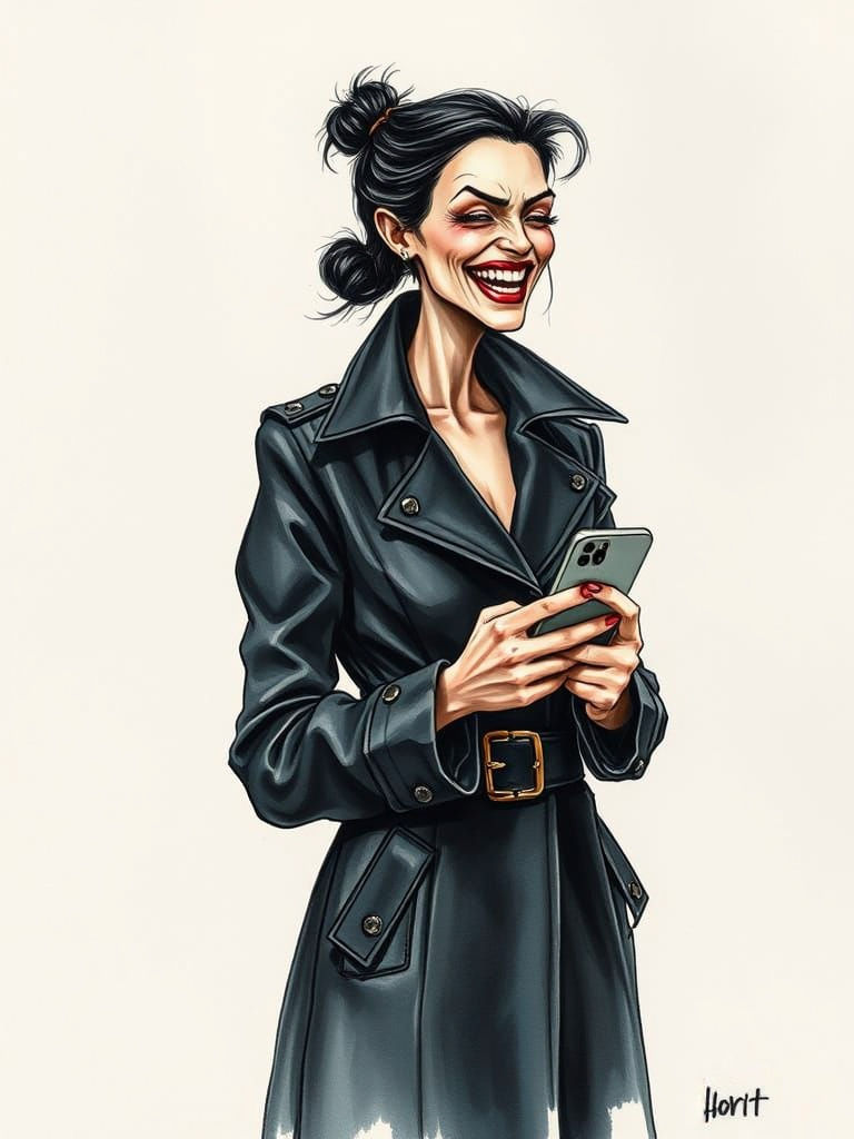 A watercolour sketch of a sinister woman in a leather coat, gleefully using her iPhone. The artwork captures a rough, textured aesthetic on rag paper.