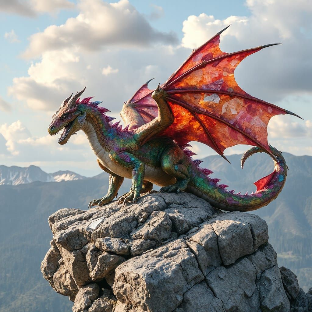 A colorful dragon made of sharp crystals sits atop a massive rock, gazing out over the valley. The dragon's body is formed of glittering crystals.