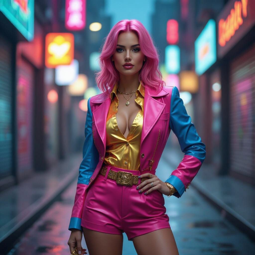 A hyperdetailed, photorealistic portrait of a brilliant detective with pink hair, dressed in vibrant gumshoe attire. Set in a neon-lit, retrofuturistic alleyway with noir elements.