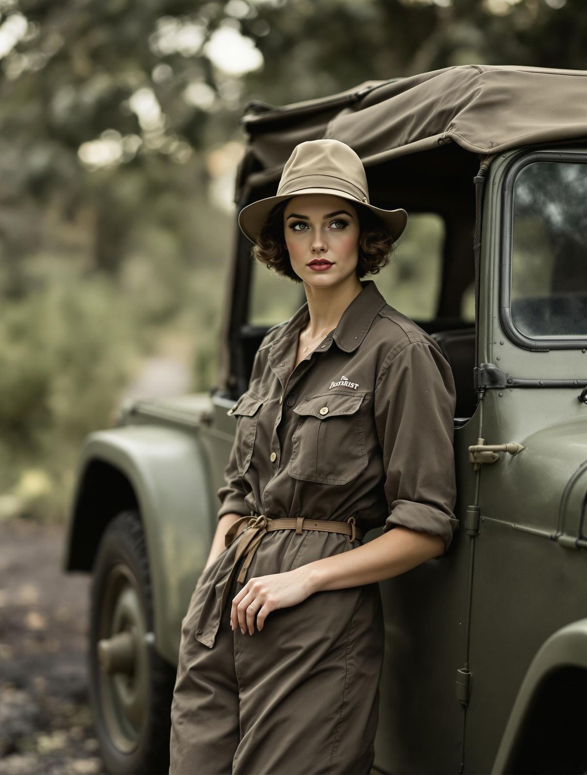 This image shows a female botanist in 1930s Madagascar, posing next to her jeep. She is dressed in safari attire with a pith helmet, captured with intricate textures in an autochrome style.