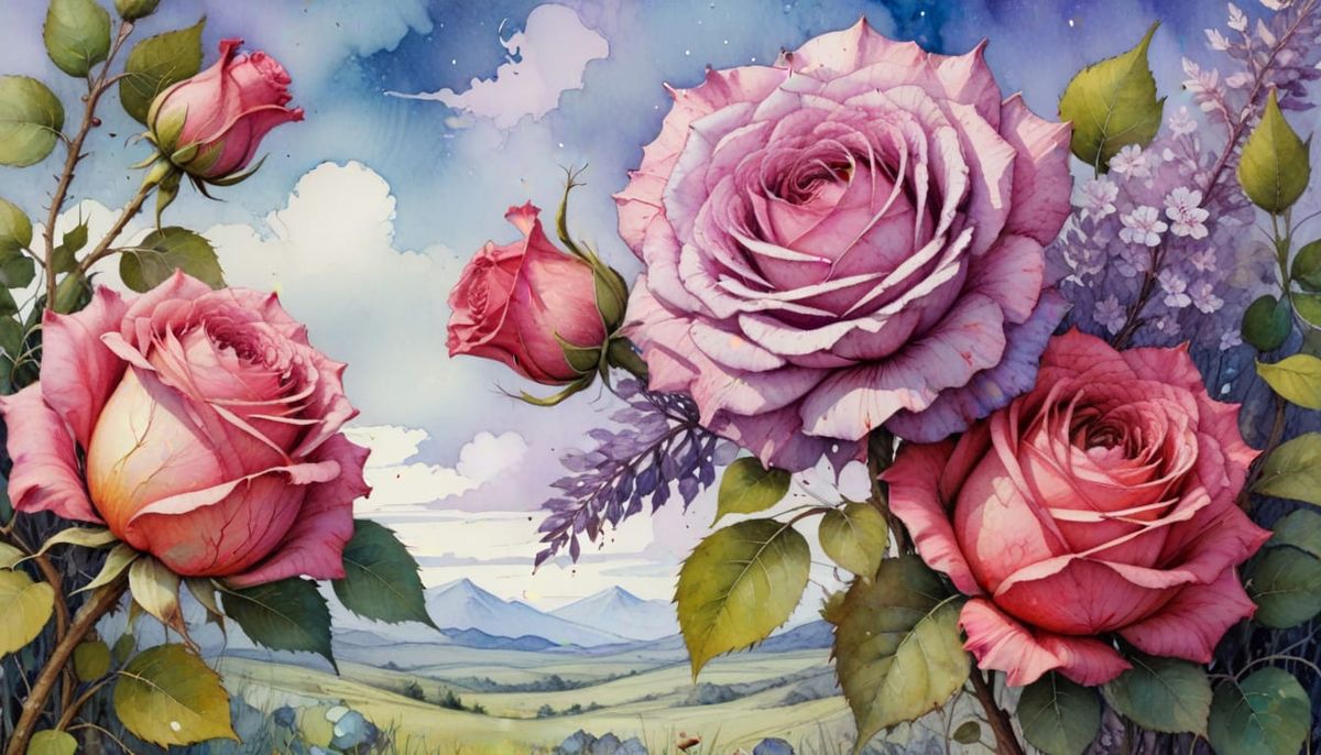 This image shows a dreamy, watercolor-inspired landscape with dominant pink and purple colors, creating a captivating and imaginative scene.