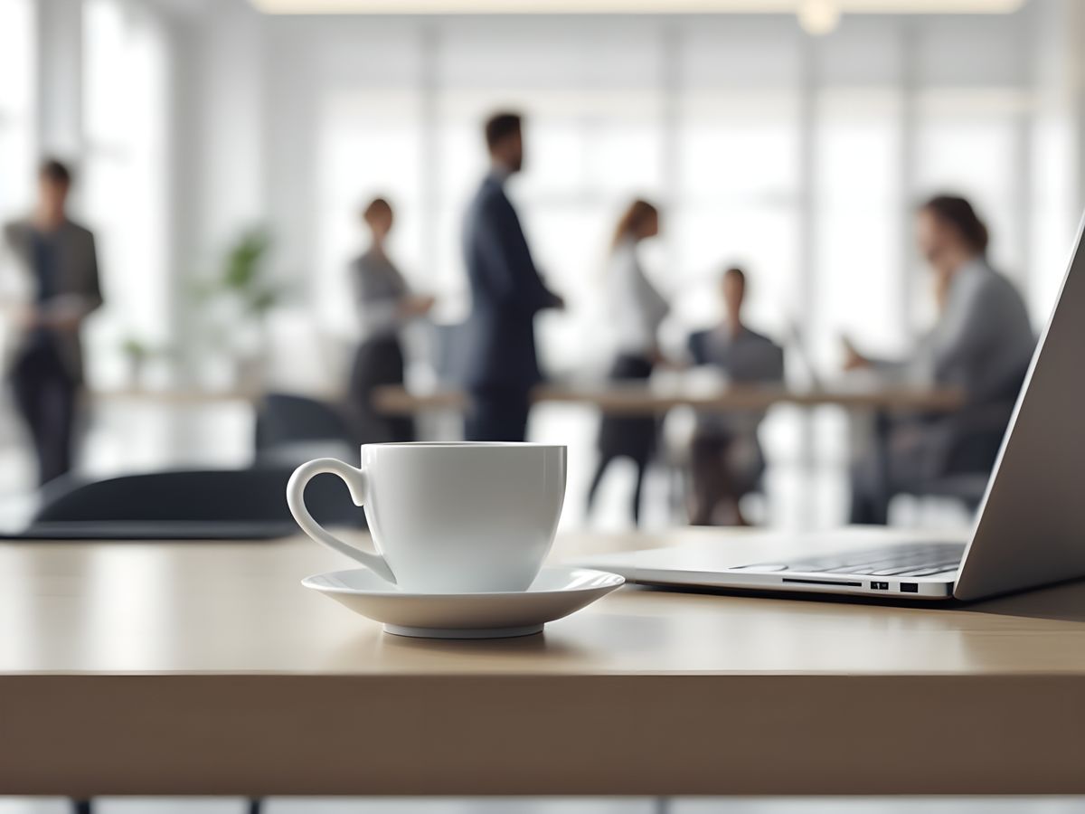 This image shows a white coffee cup and laptop on an office table, conveying a business concept. The backdrop features blurred business people in a clean office environment.