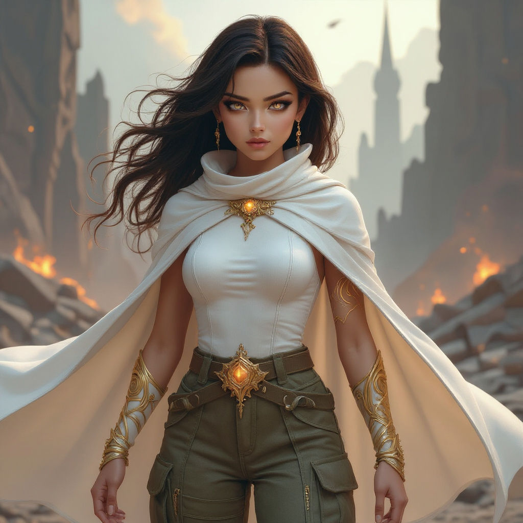 This image shows a magical girl with flowing dark brown hair and glowing amber eyes. She wears a white cape and outfit, adorned with gold magical tattoos, against a backdrop of destruction.