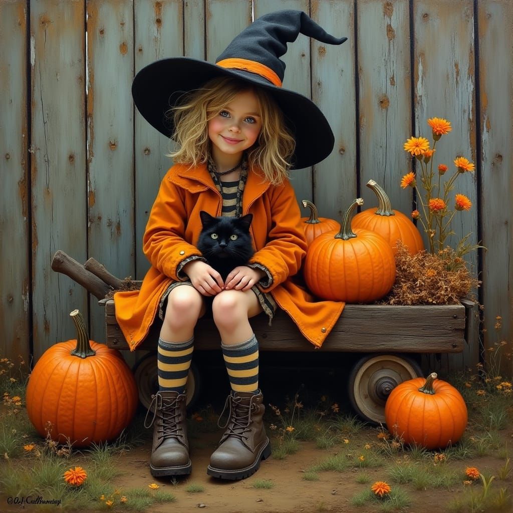 This image showcases a happy Indigenous bohemian woman in a muted fall scene, painted with thick, expressive brushstrokes. She sits with pumpkins on a wagon beside a black cat.