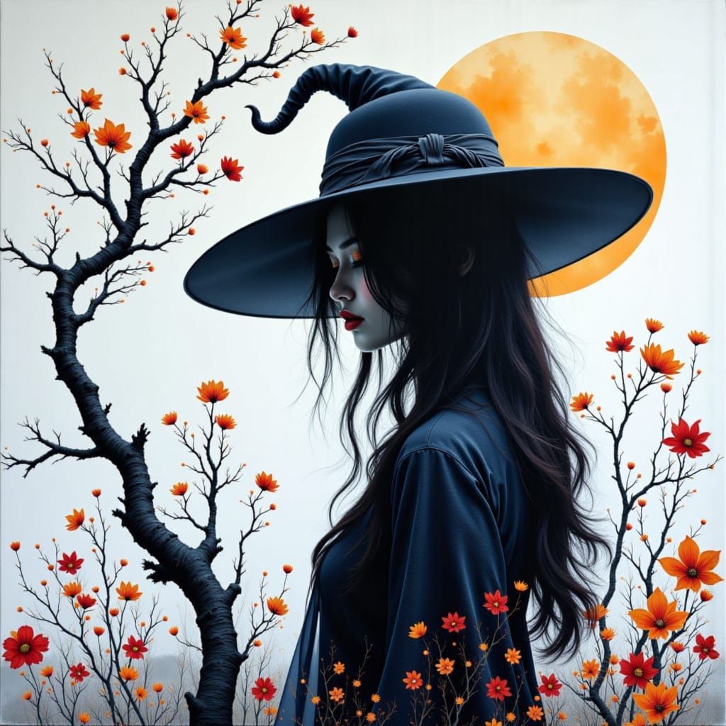 <lora:Minamax:1.0> Spiriling Double exposure close witch wearing hat Digital watercolor Illustration of a landscape midnight, by Waterhouse, Carne Griffiths, Minjae Lee, Ana Paula Hoppe, Stylized watercolor art, Intricate, Complex contrast, HDR, Sharp, soft Cinematic Volumetric lighting, flowery pastel ...