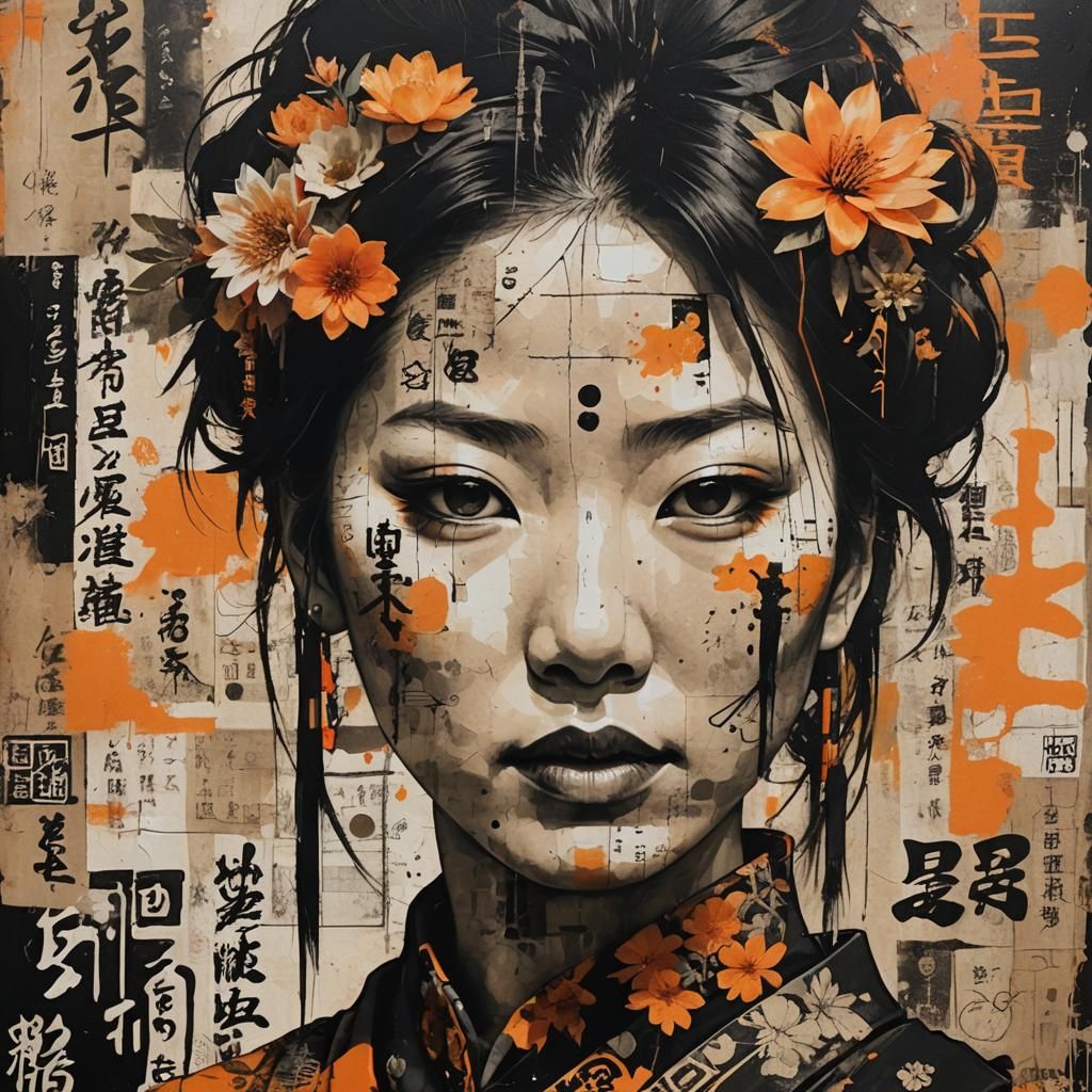A surreal image of an Asian woman's face with black and orange tones. The artwork includes textures, graffiti, and kanji in a punk collage style, reflecting wabi-sabi art principles.