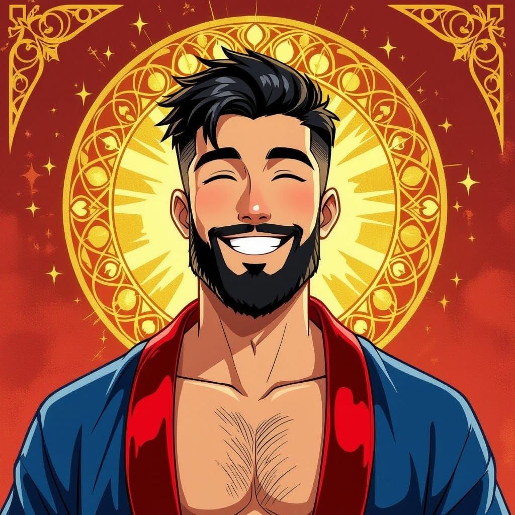 This image features a handsome man with a beard, wearing a blue velvet robe, illuminated by a golden halo and light. Rendered in an impressionist style with rich textures, it evokes a 3D game cinematic feel.