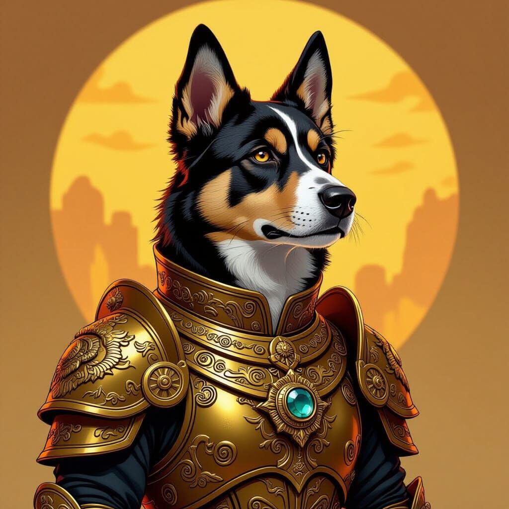 This image shows an armored dog with dragon patterns. The digital illustration features steampunk elements and a warm color palette, creating a detailed and ornamental design.