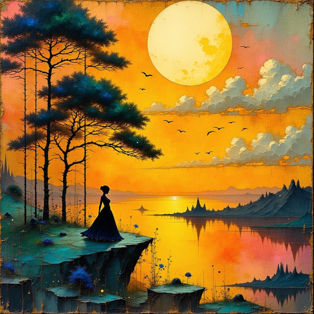 This image is a stunning art deco-inspired depiction of a woman gazing out at a breathtaking surreal sunset landscape, with soft colors and intricate details reminiscent of Klimt's style.