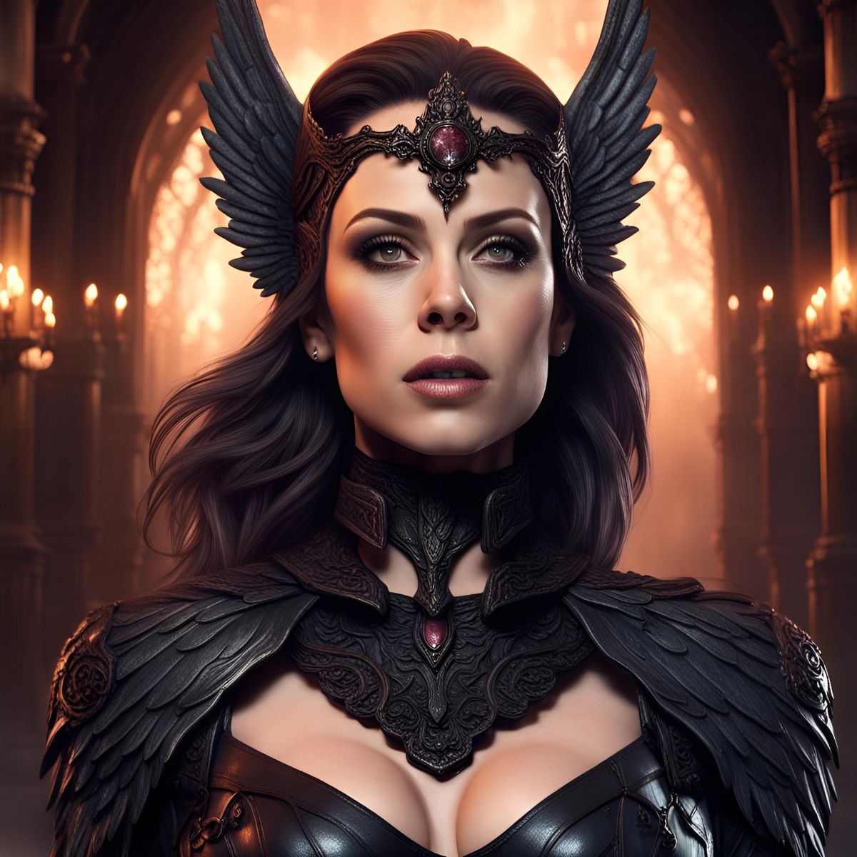 A detailed matte painting of a dark angel resembling Alyssa Milano in a netherworld. The fantasy concept art features deep colors and intricate details.