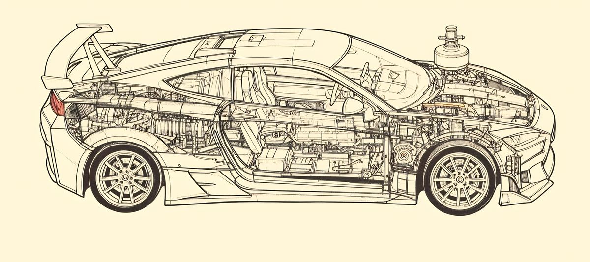 This image shows a cutaway diagram of a sports car with abstract expressionist elements. The sketch features glowing radioactivity and is rendered with paramount light in high resolution.