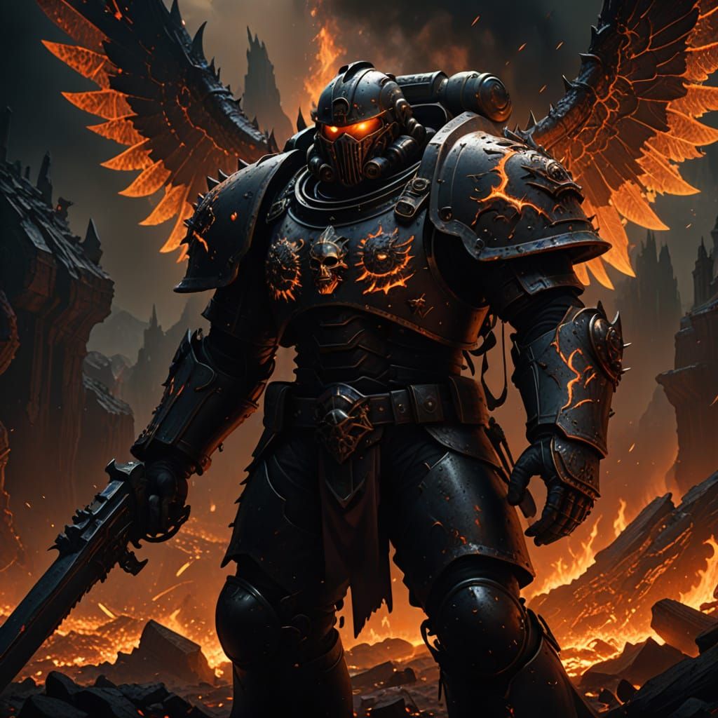 A grim picture of a corrupted space marine in a hellscape. The figure features twisted armor with spikes and fiery wings. The scene is lit dramatically with intense shadows.