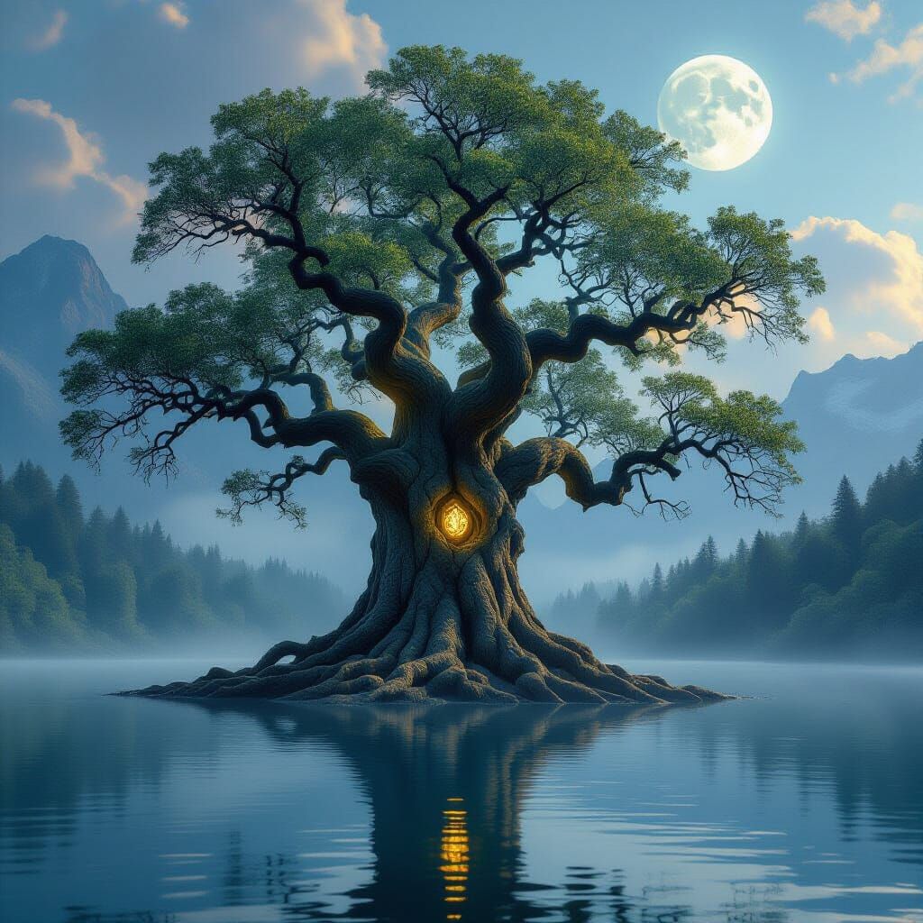 Generate your own mystical ancient trees with glowing runes on misty lakes. Free and easy AI image creation.