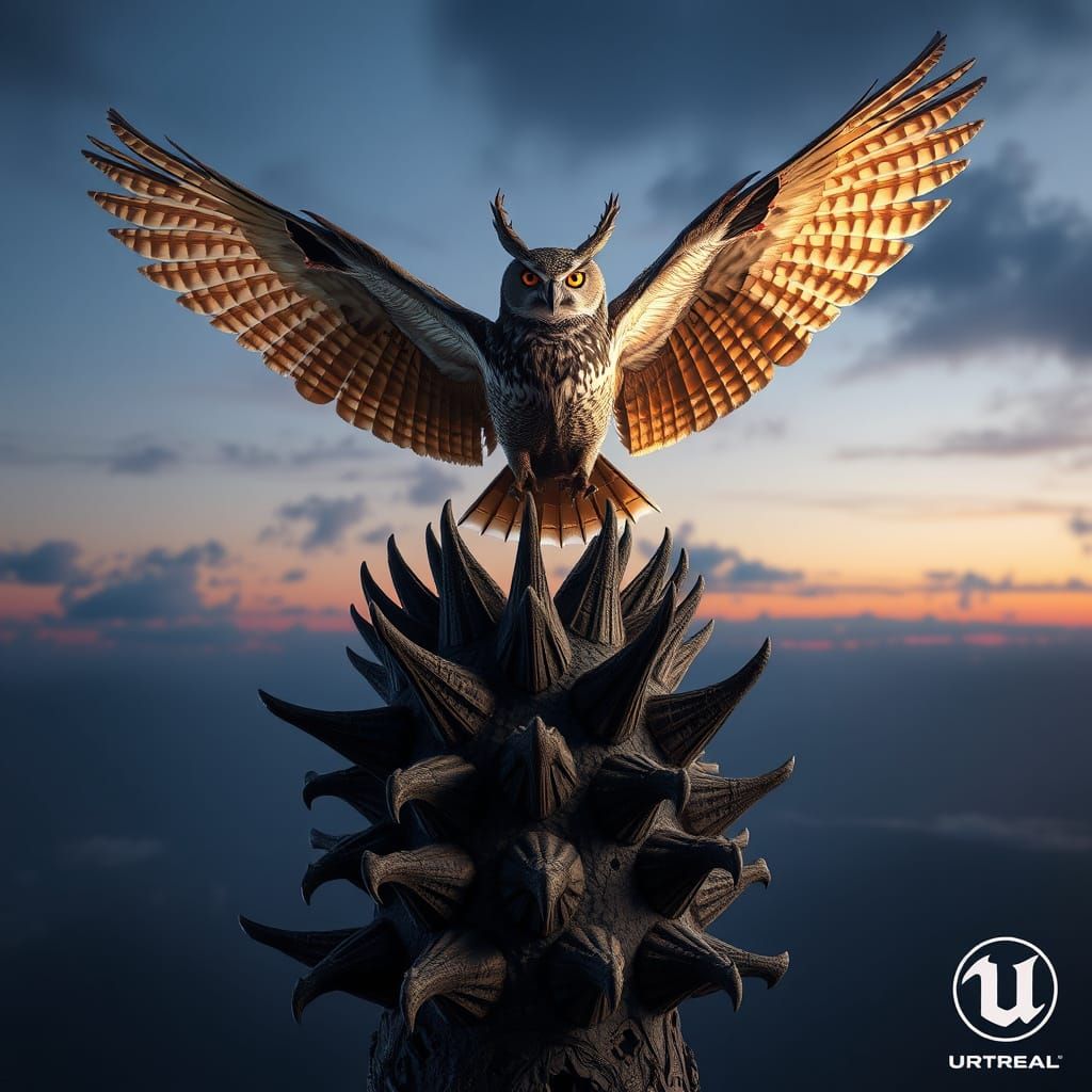 A majestic great horned owl soars over a bizarre tower of beaks at twilight. This captivating image, rendered in a dark fantasy style, blends surreal architecture with dramatic lighting.