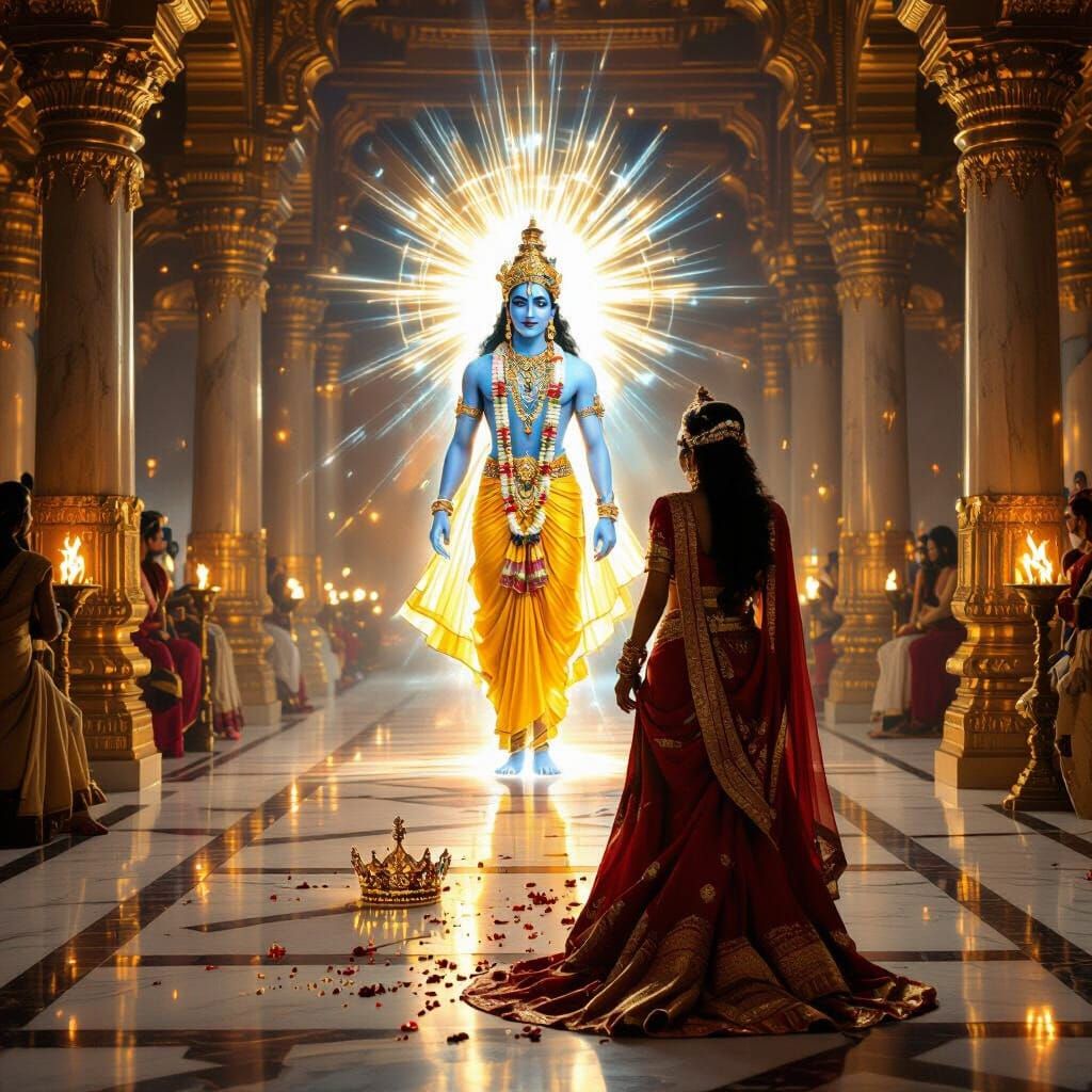 A hyperrealistic scene of Lord Krishna manifesting divine light to protect Queen Draupadi during her humiliation in the Hastinapura royal court. The image captures Krishna's compassionate power and ethereal radiance.