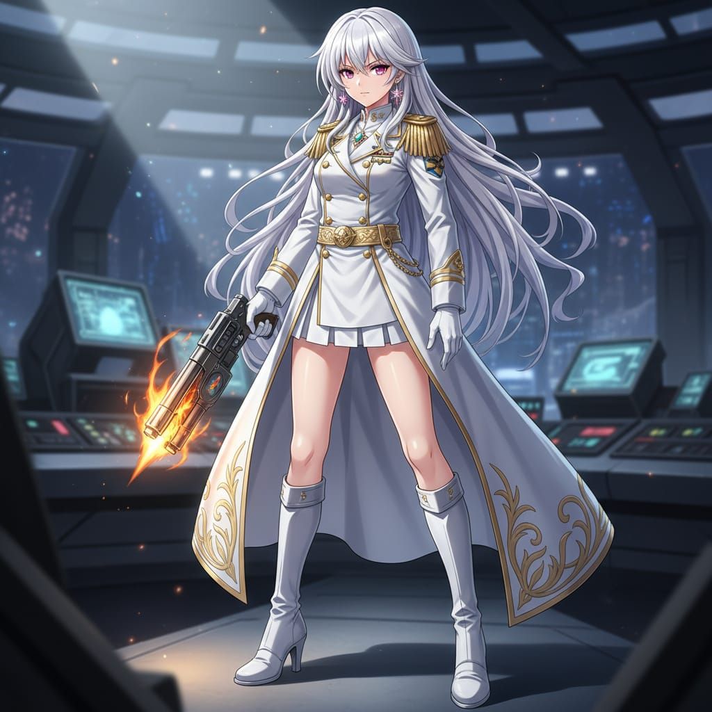 This image features a determined anime female admiral in a white navy uniform, complete with a flowing coat, pistol, and high-heeled boots. Her long white hair and pink eyes stand out in dramatic lighting.