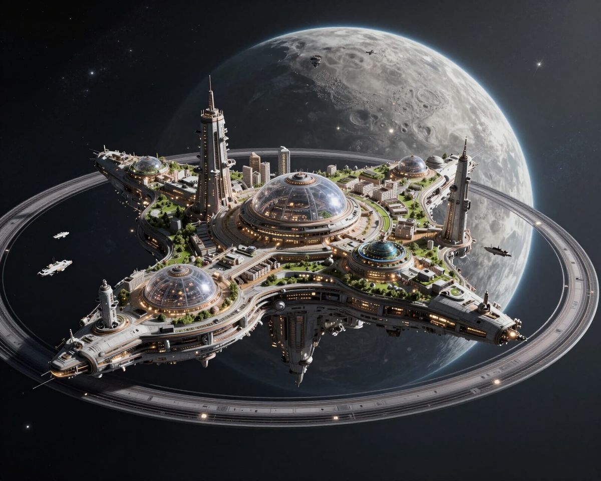 This image shows a massive, moon-sized world-ship carrying a civilization through space. It features intricate structures, illuminated cities, and rotating rings, emphasizing vast scale and interstellar travel.