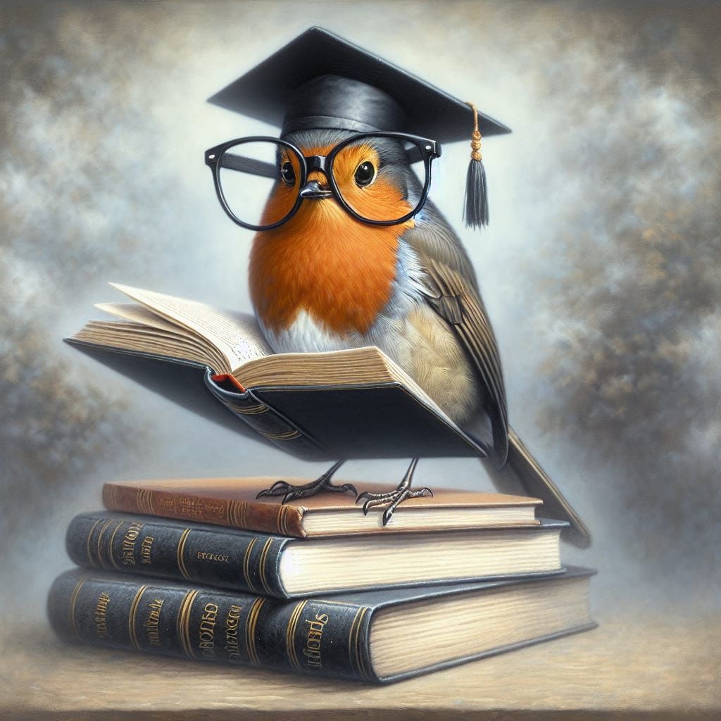 A charming image of a robin wearing a doctoral hat and glasses, perched on books and holding an open book. Misty hues create an enchanting scene blending nature and academia.
