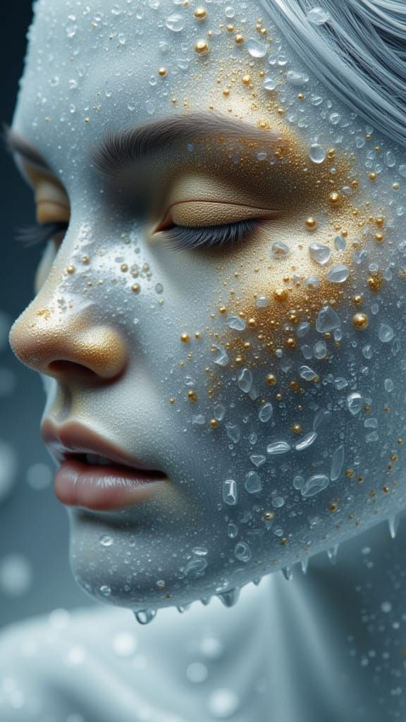 This 3D rendered image features a woman with metallic liquid silver skin and gold accents. Crystal frost patterns adorn her face, with icy eyelashes, in an ethereal atmosphere.